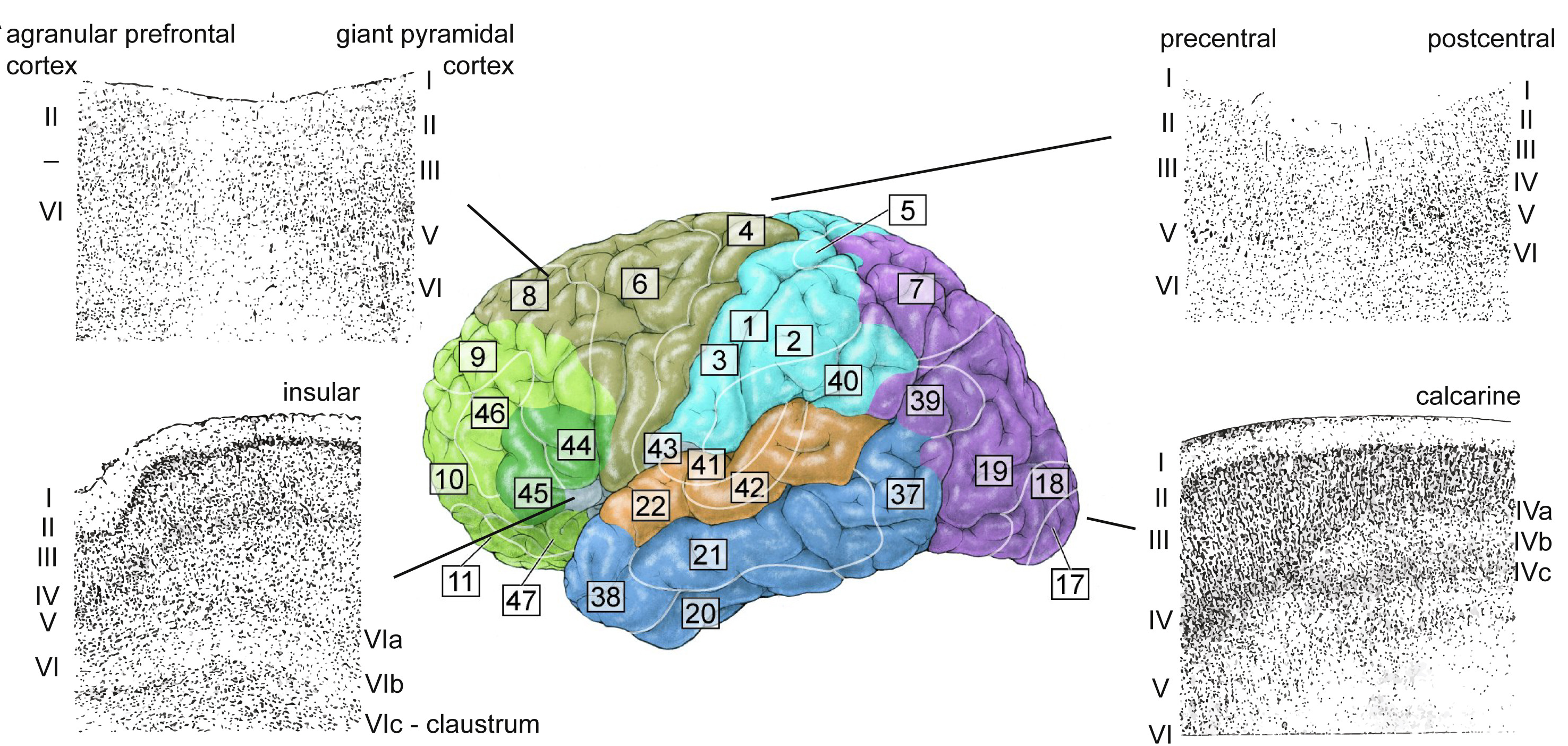 人类和猴子大脑皮层的52个布罗德曼区域(Brodmann area),由科尔比尼安·布罗德曼(Korbinian Brodmann)博士在一个多世纪前划分,在指代大脑皮层区域时被广泛使用(图3.4)。这些分区的标准是不同区域的神经元细胞核密度与分布存在差异,例如在尼氏染色后,不同分区间存在过渡。对脑的分区,按功能分更合理,只是当年技术原因只会染色。布罗德曼编号的逻辑多受诟病,但也是个难以重写的历史经典。