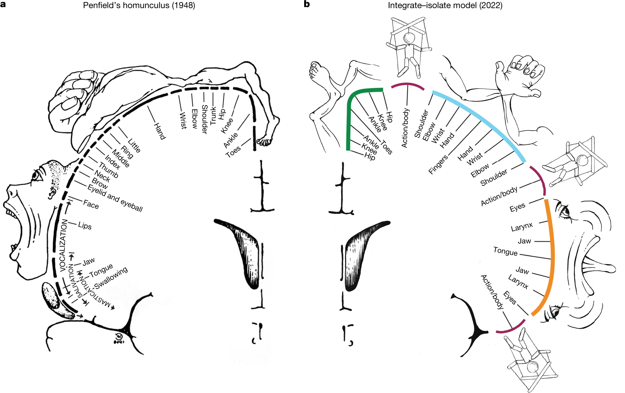 图3.3:对人体运动皮层经典分区(左图)的更新(右图),来自一项对猕猴和幼儿的功能核磁研究[3],在传统分区中发现了不对具体刺激反应,但在涉及手脚协同、身体转动等动作时活跃的区域(图中标注Action/body)。