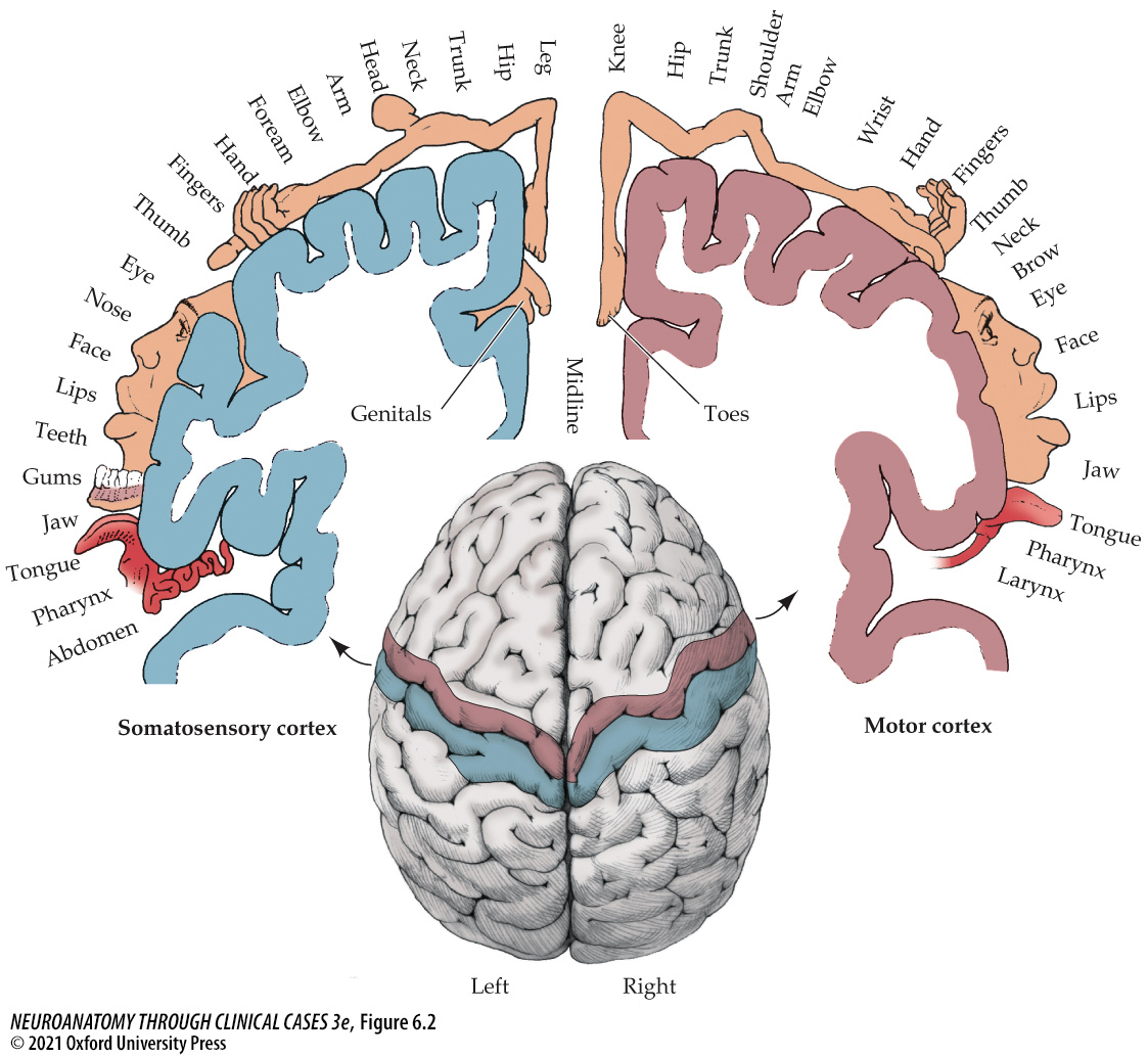 图3.2 大脑皮层负责感觉和运动的区域对应的身体部位。
