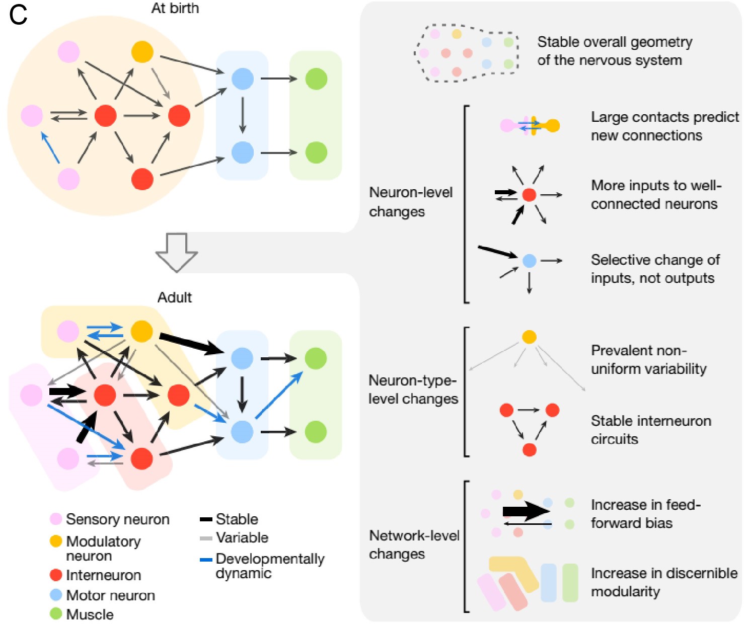 图3.1 线虫中枢神经系统中突触从刚孵化时到成年的模块化示意图,其中的成熟后脑的模块由细胞类型定义,包含感官、运动、调控等,图中还包括了前馈、反馈和循环连接。来自[2]。