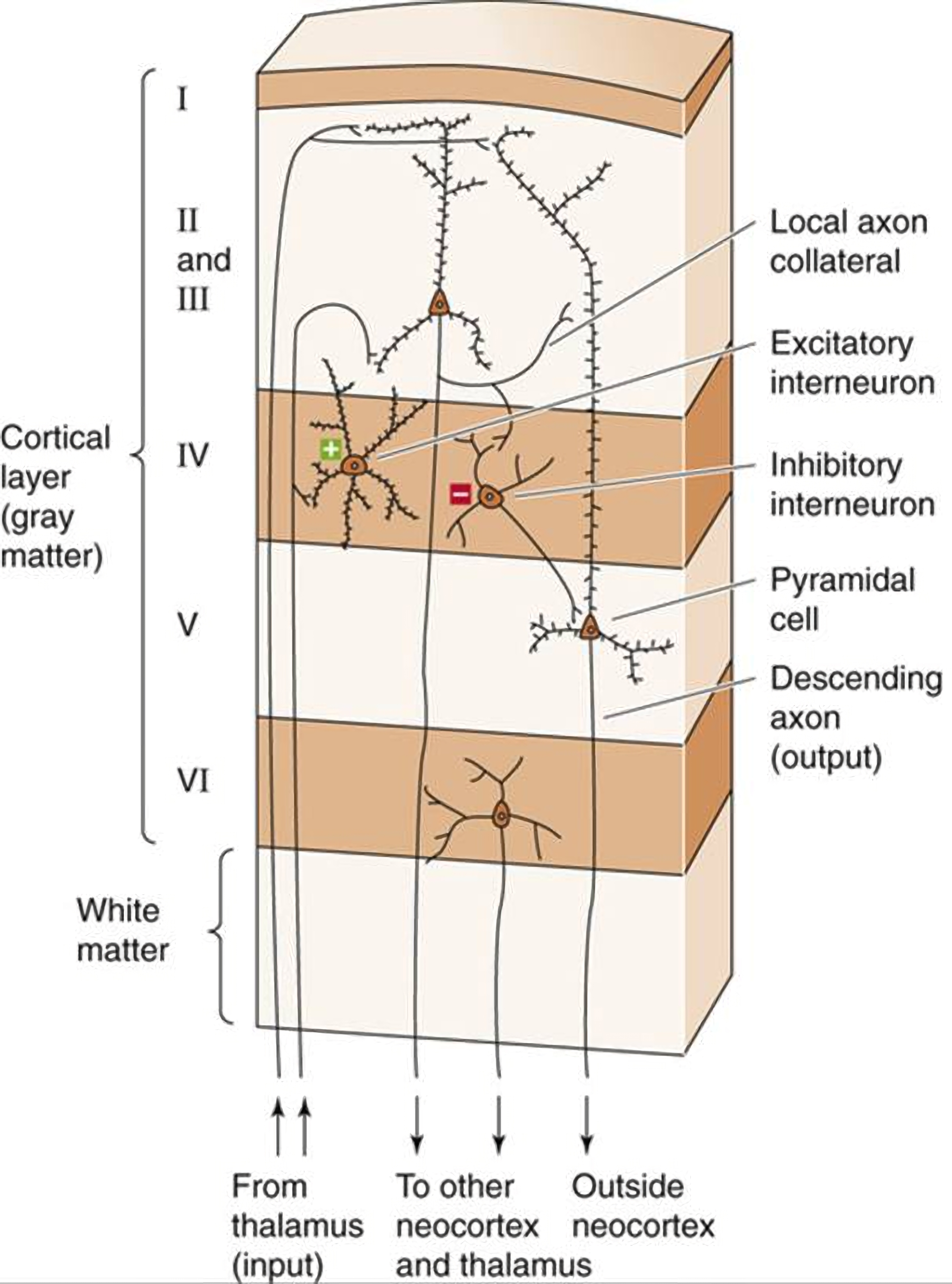 图2.1 哺乳动物大脑皮层分为六层。来自丘脑的信号到达第I和第IV层,而第V、第VI层负责汇总和输出。来自[1]。