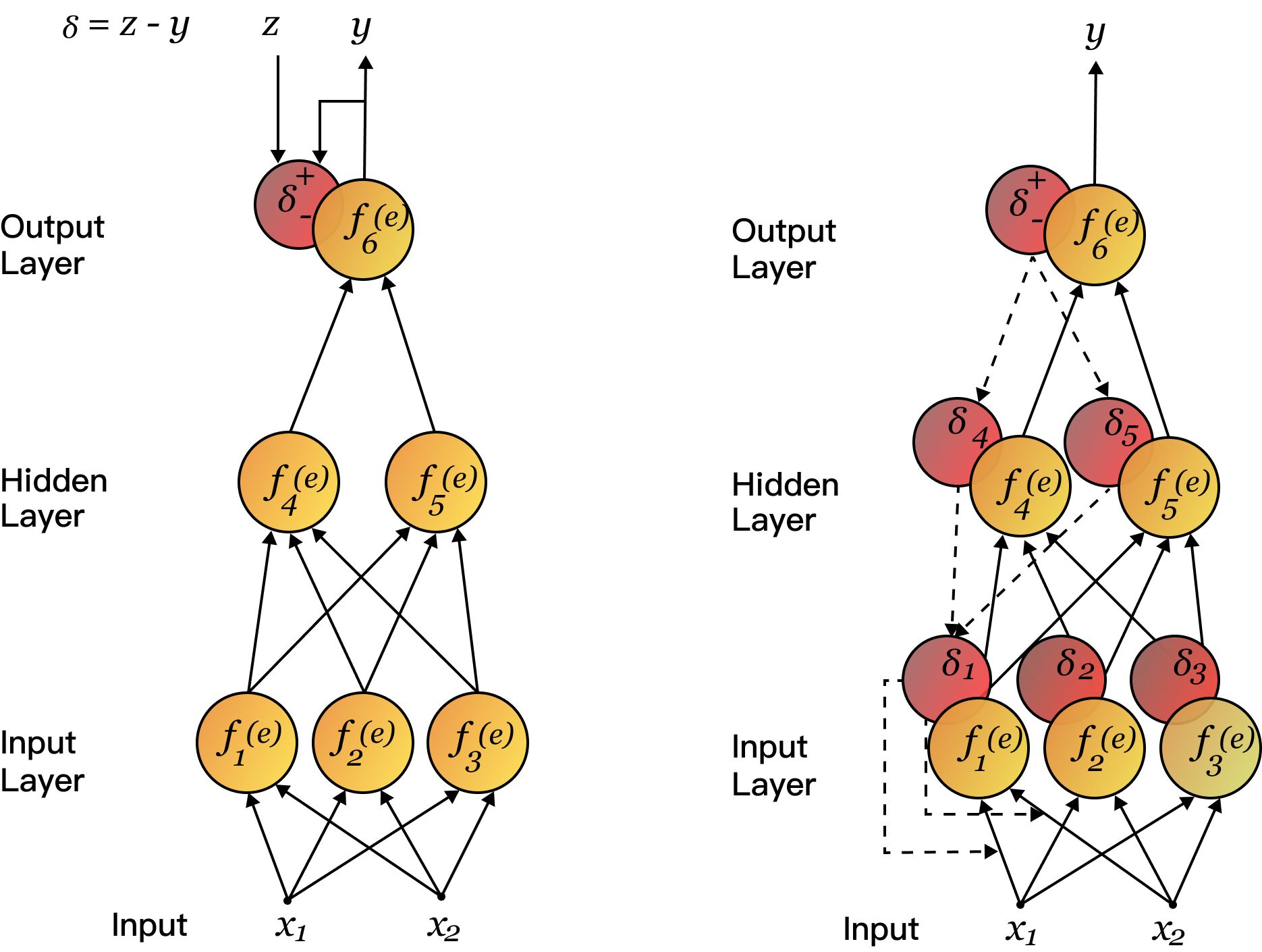 图2.2 在一个简单的三层网络中的反向传播。神经元的输出在各层中向前传播,并被求和以预测y。这个y和目标z之间的不同,通过上一层传回,这导致修改权重后,重新对输入加权向前传播,并再次比较。算法通过梯度下降法使得训练后的神经网络,在输入和输出间更准确地拟合。