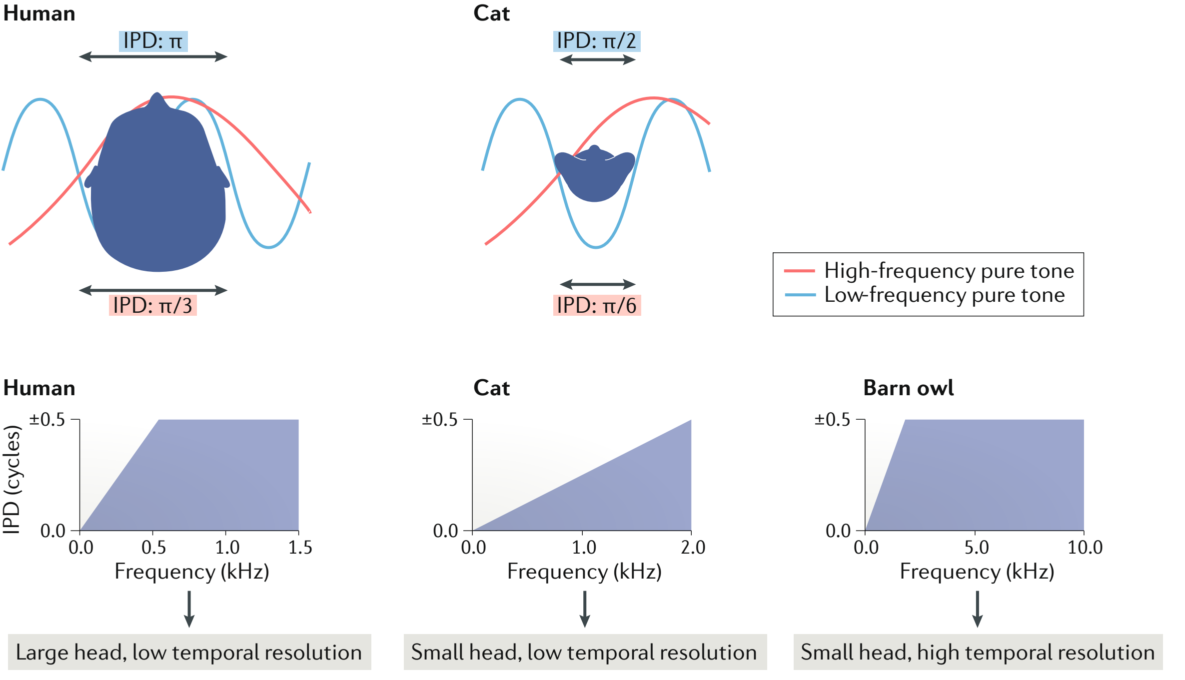 图10.2 耳间相位差(IPD)的生理范围是听觉频率、头部大小和听觉系统的时间分辨率的函数。对于周期性的音调,高达音调周期的一半的耳间时差(ITD)可以用耳间相位差来表示,即IPD。(A)对IPD的检测取决于头部的大小。针对低频率声音(包括说话的频率)人类有相对较大的头部大小,IPD比ILD(耳间水平(强度)差异)更大,由此可判定方位。(B) 除了头部大小外,IPD还受到听觉系统时间分辨率的限制,即听觉神经纤维和皮层下听觉通路后续阶段的最高锁定频率,对于仓鸮,该频率可达到10 kHz,因此其可通过听觉进行高分辨率的空间定位。