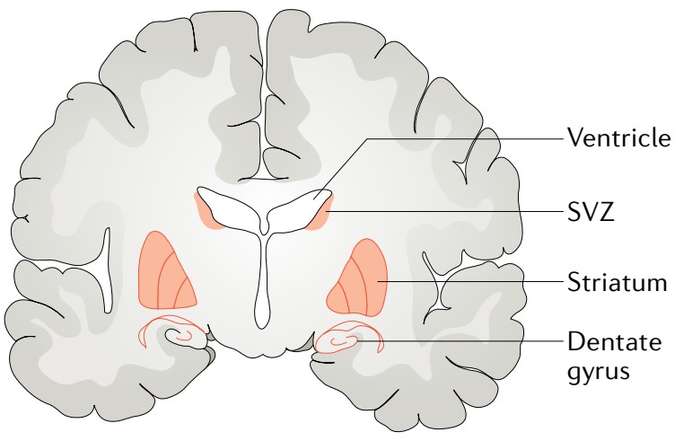 目前成年人类大脑中可能仍有新增神经元的区域包括脑室下区(SVZ)、海马和纹状体(striatum) [2](图16.1)。小鼠脑室下区的胆碱能神经元((释放乙酰胆碱、)表达乙酰胆碱酯酶以停止突触激活的神经元(choline acetyltransferase–positive (ChAT(+)) neurons)被前扣带回的神经元激活后,脑室下区中原本处于静息状态的神经干细胞被激活、分化生长[3]。
