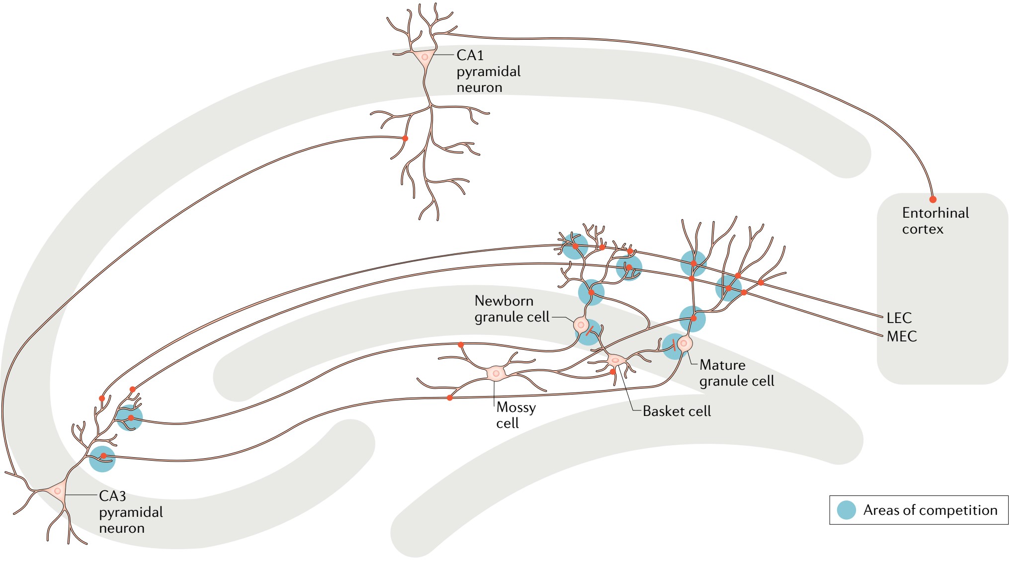 图16.3: 成年海马新生颗粒细胞的回路功能。齿状回(DG)中的新生颗粒细胞接收到的来自外侧内嗅皮层(LEC)的输入比来自内侧内嗅皮层(MEC)的轴突的输入更强。未成熟的颗粒细胞已经可以影响回路活性,比如通过直接刺激成熟颗粒细胞,或者更间接地通过激活抑制性中间神经元(如表达小清蛋白的篮状细胞)或通过激活位于齿状回内层的苔藓细胞(hilar mossy cells,也属于抑制性中间神经元)。随着成熟,颗粒细胞受到强烈的周围抑制,并在CA3锥体细胞上形成大的钮扣状结构,从而调节CA3区和CA1区的输出,信息从那里流回内嗅皮层和其他关联皮层。不同成熟阶段的新生神经元对DG回路的活动和信息流及其输出到CA3区的确切影响,需要通过体外和体内成像和电生理记录来进一步分析。蓝色阴影区域表示新的神经元可能不得不与已有的神经元竞争突触前和突触后连接的神经元伙伴。