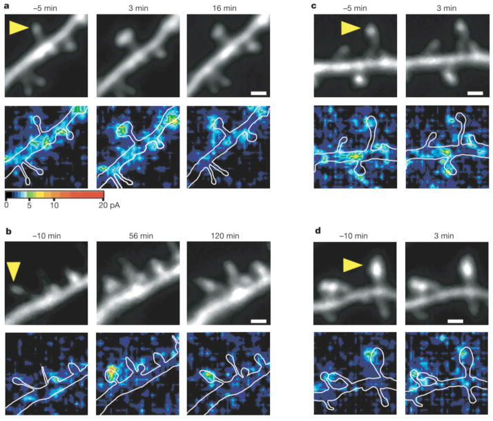 图17.2 大鼠海马体切片定点释放谷氨酸导致树突棘头部的扩大(a-d上图)的和AMPA受体介导的电流的增强(a-d下图)。箭头标注的较细树突棘从定点释放前(-5或-10分钟)与释放后比较。