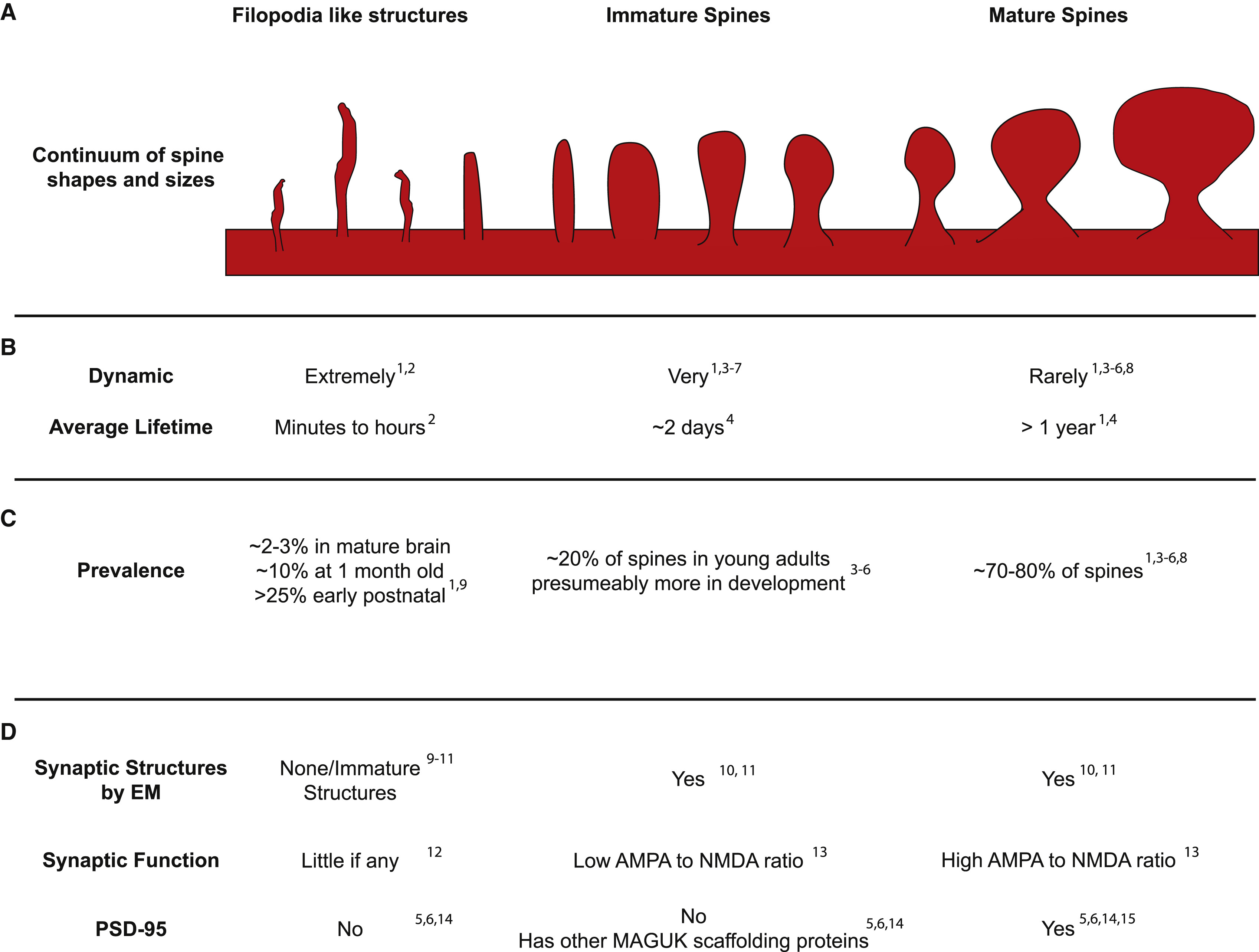 图17.1 根据形态由细到粗展示的丝状伪足、未成熟树突棘和成熟树突棘。仅根据尺寸对前两者的区分有难度。成年后成熟树突棘约占80%。来自[1]。