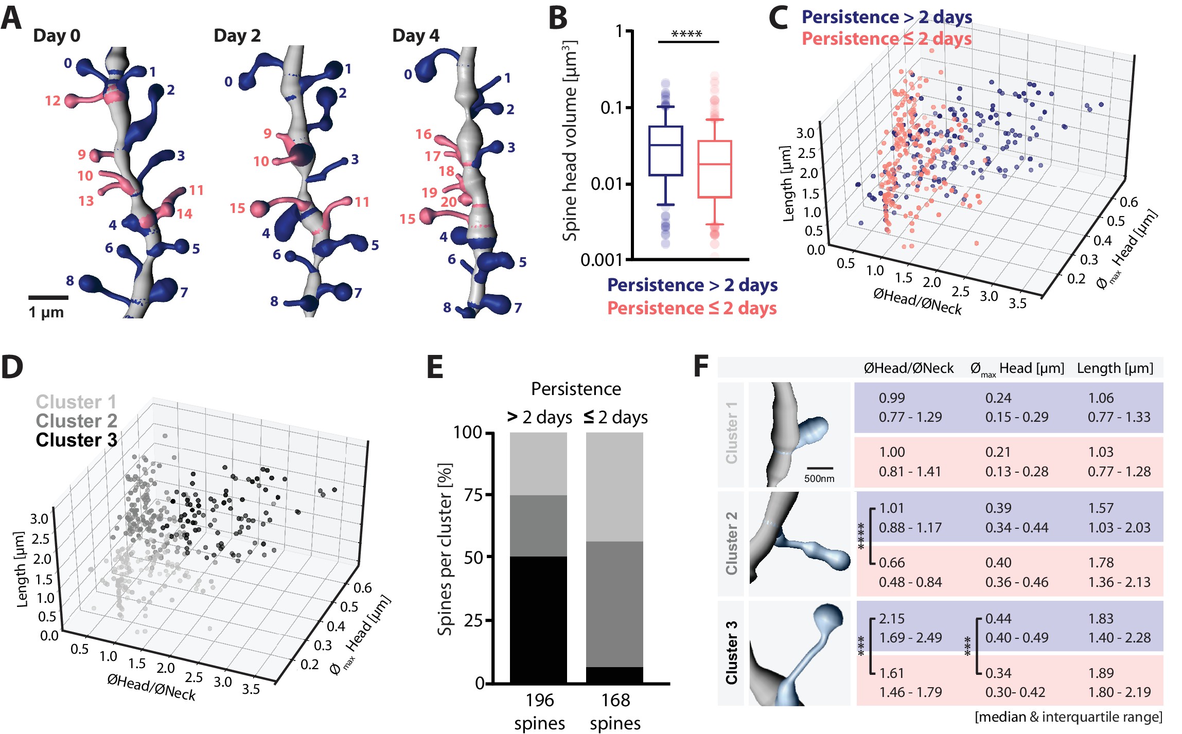 图17.3 小鼠海马体树突棘在几天内的存续与初始头部体积、头部、颈部尺寸的关系。超分辨率显微镜(2P-STED)结果。来自[8]