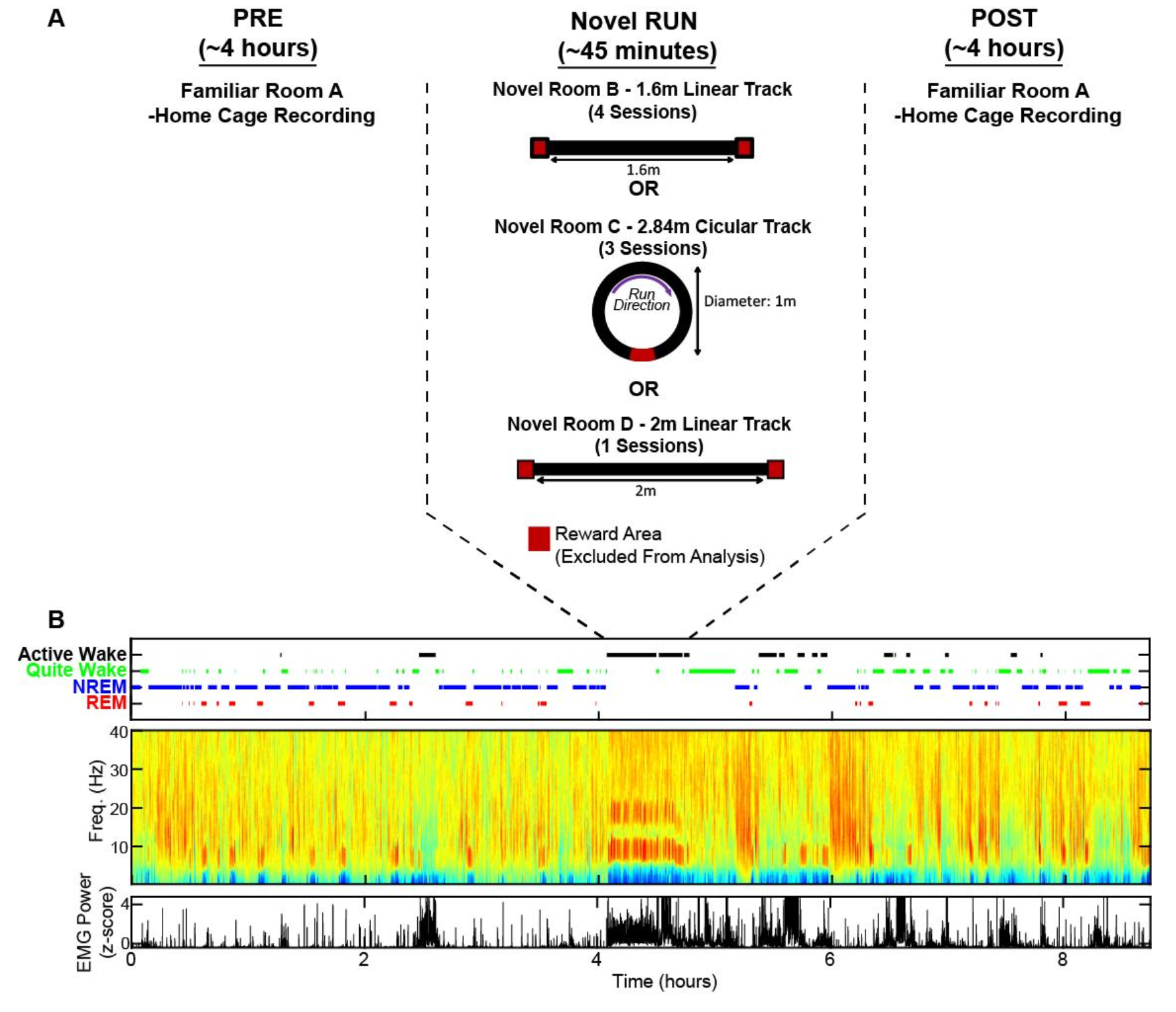 图23.2 经历迷宫学习(A)小鼠的睡眠与清醒期脑电波(B)。实验都在白天进行,这是小鼠正常应该睡眠的时段。迷宫训练期间可见稳定的theta波等。来自[14]