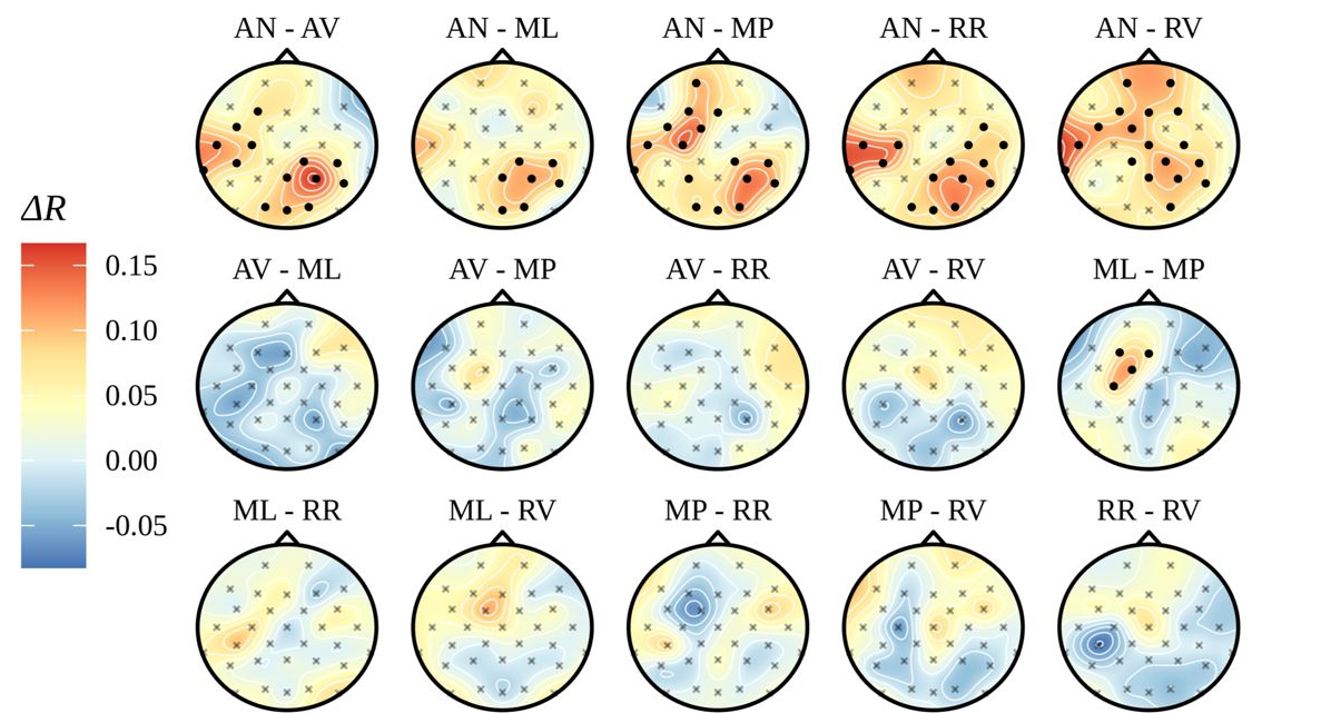 图23.1 不同类型单词组合的低频重复刺激下,电极记录的大脑活动的频率差异。例如AN(adjective-noun)组合包括old rat, sad man, ill wife,播放时音节频率为3.125 Hz,名词频率为1.5625 Hz。inter-trial phase coherence (ITPC)统计量描述大脑电活动频率与外部刺激频率的一致性。这些刺激并不中性,预计在不同志愿者中引发了不同的记忆回放。来自[7]