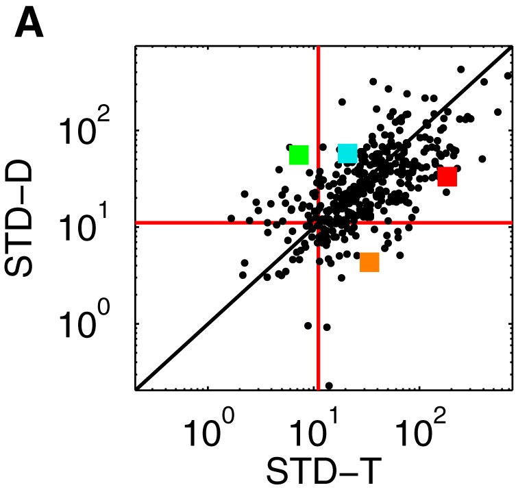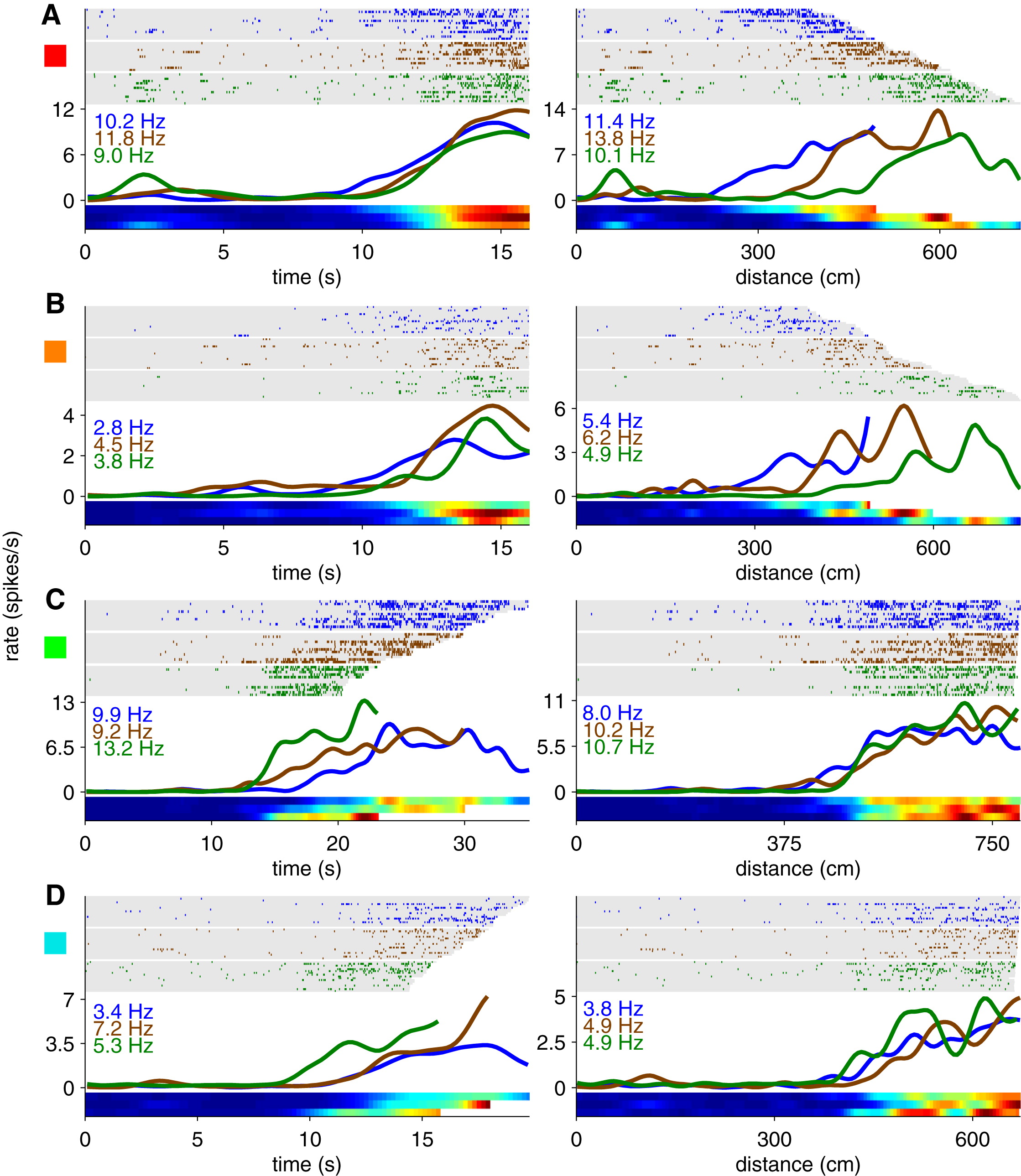 图24.1 大鼠海马体神经元对时间和距离的编码。(A和B)两个神经元受时间影响较大,(C和D)两个神经元受距离影响较大。对于每个神经元,其放电活动都分别以时间(左图)和距离(右图)为函数进行绘制。蓝色、棕色和绿色刻度线分别代表运行速度最慢的1/3、中等速度的1/3和最快速度的1/3。在每个试验中,大鼠从迷宫中央的左右两个方向之一进入,然后在跑步机上行走,获得少量水奖励。经过短暂的延迟后,跑步机加速到预定范围内的随机速度,大鼠在原地跑步,直到跑步机自动停止并再次提供少量水奖励。随后,动物通过与进入相反方向完成试验,到达目标臂末端的水口。蓝色、棕色和绿色数字表示相应组运行速度的峰值放电率(以每秒脉冲数计)。在跑步机运行速度从最慢(顶部)到最快(底部)排序的栅格图中,行代表跑步机运行。每个神经元(A-D)左侧边缘的彩色方块对应于图E中的彩色方块。(E)每个点代表一个神经元。红线表示显著性的最小阈值。位于右上象限的点对距离和时间都有反应。位于左上象限的点仅对距离有显著影响。位于右下象限的点仅对时间有显著影响。位于左下象限的点对时间和距离都没有显著影响。位于对角线上的点距离和时间的贡献相等。