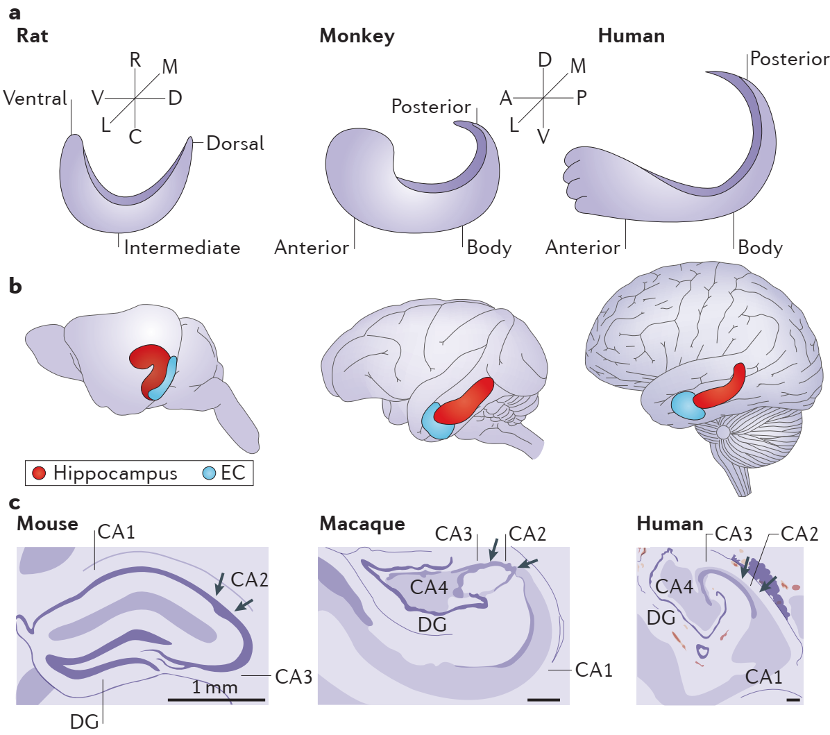 图24.2 几种哺乳动物的海马区及内嗅皮层解剖比较。(a) 大鼠(及小鼠)的海马长轴是背侧-腹侧分布,而猕猴和人类的海马长轴是后-前侧分布(anteroposterior,动物也称喙端尾端rostrocaudal),旋转90度后一致。虽然还没有严格定义,但是背侧或者后侧更接近扣带皮层(retrosplenial cortex),腹侧或者前侧更接近杏仁核复合体(amygdaloid complex)。(b) 大鼠、猕猴、人类海马(红色) 和内嗅皮层(EC,蓝色)在大脑的分布。(c) 根据Nissl染色的小鼠、猕猴、人类海马纵切面所作的示意图。A, anterior; C, caudal; D, dorsal; DG, dentate gyrus,齿状回; L, lateral; M, medial; P, posterior; R, rostral; V, ventral。CA1与CA3基本平行,中间相对垂直的区域为CA2区,而CA3后面弯进齿状回的为CA4区。来自[7]。图15.1复用。