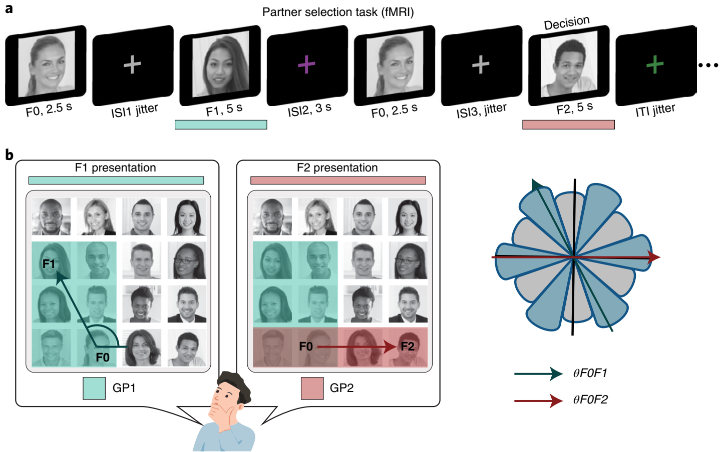 图29.1 空间导航技能在伙伴选择任务中的应用。(A) 在fMRI中进行伙伴选择任务的一次试验的示意图。参与者通过反馈式二元比较学习了伙伴的相对排名,比较的是两个相差一个排名的个体,每个维度在不同的天份进行,并需要推断出试验任务中的二维地图。然后,参与者被要求做出二元决策,即在给定的个体(F0)和两个(F1和F2)之间选择一个更好的商业伙伴。更好的伙伴由每个合作对可以预期的增长潜力(GP)决定。当F1出现时,参与者可以计算F0和F1对的GP,当F2出现时,参与者可以计算F0和F2对的增长潜力。在F2呈现期间,参与者被要求做出决策。没有给出反馈。要计算一对的增长潜力,参与者被指示增长潜力对应于每个维度中“对排名”中的较高排名。参与者还被要求在两个维度中平等地权衡“对排名”。因此,增长潜力对应于二维等级中两个人在每个维度中的较高排名所绘制的区域(绿色矩形) 红色矩形);在这个例子中,F1是F0更好的伙伴)。该研究的作者假设人们会推断出在F0和每个潜在伙伴(F1和F2)之间在心理重建的二维空间上的直接轨迹,以计算每个合作的增长潜力,寻找通过重建的认知地图推断出的轨迹的六向调制的神经证据。ISI,刺激间隔;ItI,试验间隔。图片来源[14]。