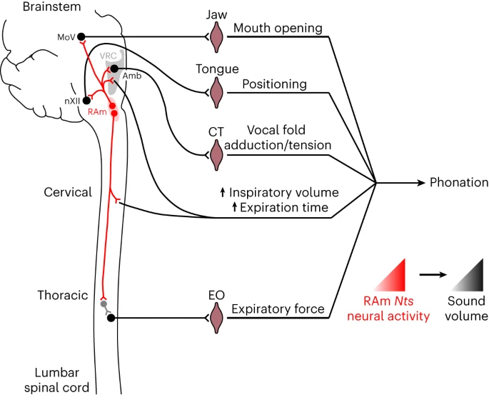 [6] Veerakumar, A., Head, J.P. & Krasnow, M.A. A brainstem circuit for phonation and volume control in mice. Nat Neurosci 26, 2122–2130 (2023). https://doi.org/10.1038/s41593-023-01478-2