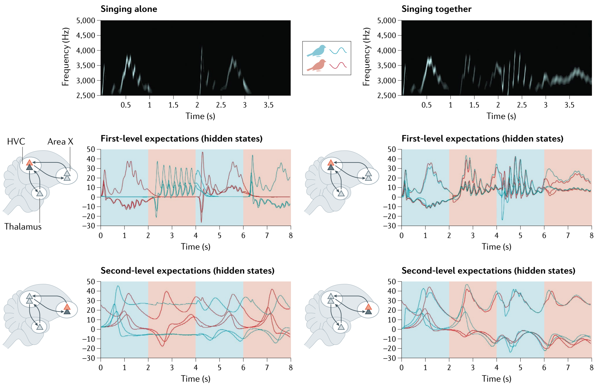 图35.3 利用鸟鸣进行通信。两只具有相同生成模型但初始条件不同的鸟(A)轮流唱歌2秒,然后倾听回应(B)。阴影区域表示当前正在唱歌的鸟:红色表示第一只鸟,蓝色表示第二只鸟。唱歌时,感官预测误差被抑制,以便通过行动实现预测。相反,倾听时,感官预测误差通过以更高精度采样,从而被关注。上面的面板显示了第一只鸟听到的声谱图(下面的面板中的红线;请注意,上下面板的时间尺度不同)。在(A)中,两只鸟无法彼此听到,而在(B)中,它们可以彼此听到。第一只鸟(红色)的后验期望以时间为函数显示在上方——第二只鸟(蓝色)的相应期望以蓝色显示。在左侧子图中,由于这只鸟只能听到自己,声谱图反映了基于高级发声肌(HVC;中间子图中的前运动区)和区域X(更高级别的区域,下部子图)的期望的下降性本体预测。中间和下部面板中分别报告了关于生成鸟鸣的基础原因(即振幅和频率的波动)的HVC和区域X的期望。请注意,当鸟儿倾听时,它们在第一级上的期望会降至零,因为它们听不到任何东西。然而,区域X较慢的动力学可以在每次倾听期结束后再次生成歌曲。在右侧子图中,两只鸟可以听到彼此。在这种情况下,在感官和超感官层次上都显示出同步的期望。请注意,声谱图在连续的2秒时间段内生成——交替由第一只鸟和第二只鸟生成。精度的关键作用再次显现;在这里,选择性地关注由鸟儿产生的感官流——以一种协调的方式,使它们能够轮流唱歌和交流。来自[3]。
